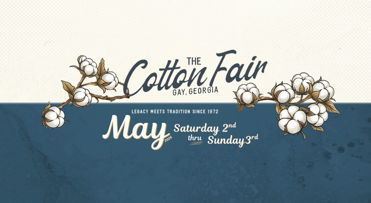 The Cotton Fair has been a staple in the community of Gay, Georgia for over 50 years. Each year during the first weekend of May and October, the Festival brings a bustling crowd into our historic town of Gay. The festival is a chance to discover unique, skilled artisans and one-of-a-kind crafts and antiques.